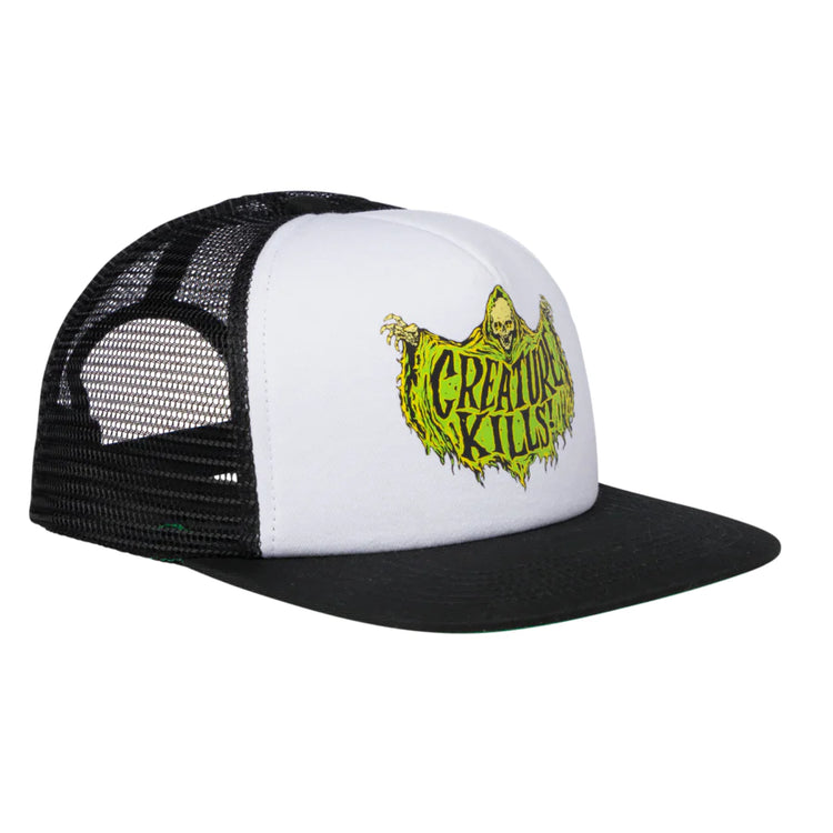 Unleash your inner fiend in the latest headwear and apparel from Creature Skateboards. The new Reaper Kills high profile, 5 panel mesh trucker hat features Reaper Kills center front screen print, loop label at rear snapback adjuster and custom interior taping. Artwork by Max Sherman. Lurk with us.